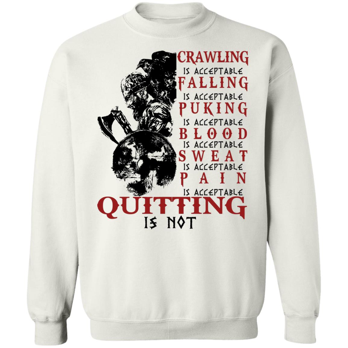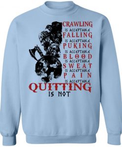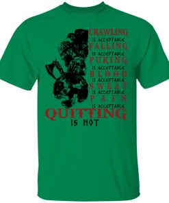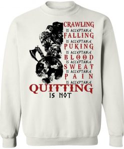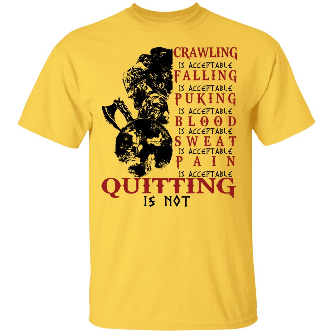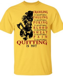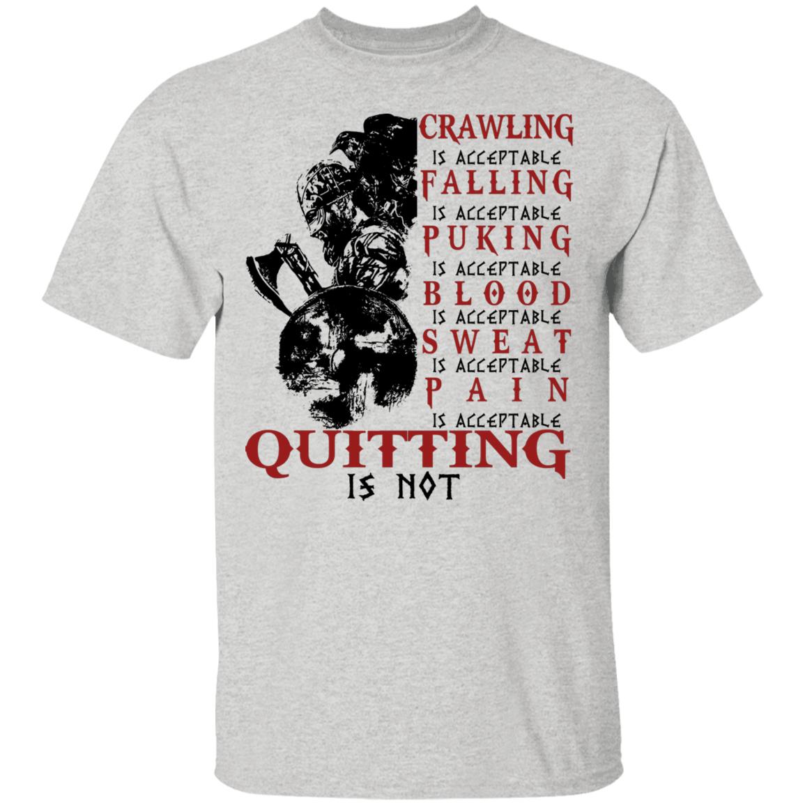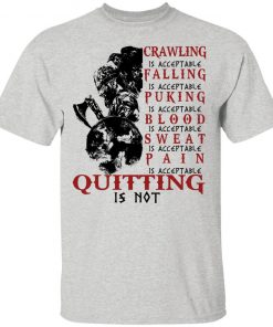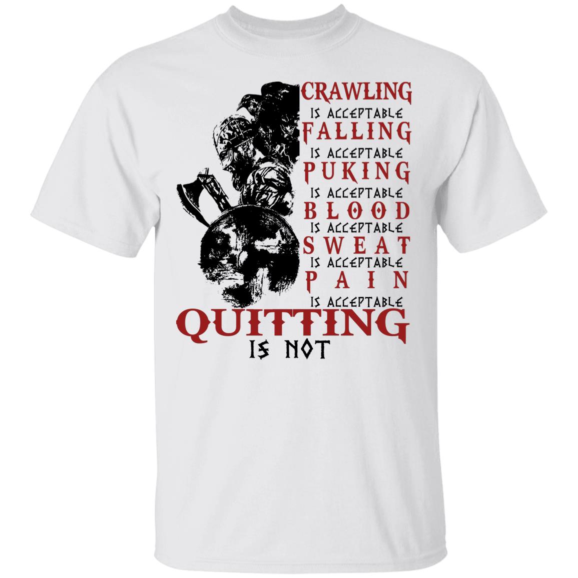 This shirt shows the rules of the Viking warriors. Crawling is acceptable. Falling is acceptable. Puking is acceptable. Blood is acceptable. Sweat is acceptable. Pain is acceptable. Quitting is not acceptable.
