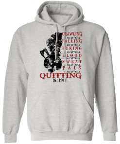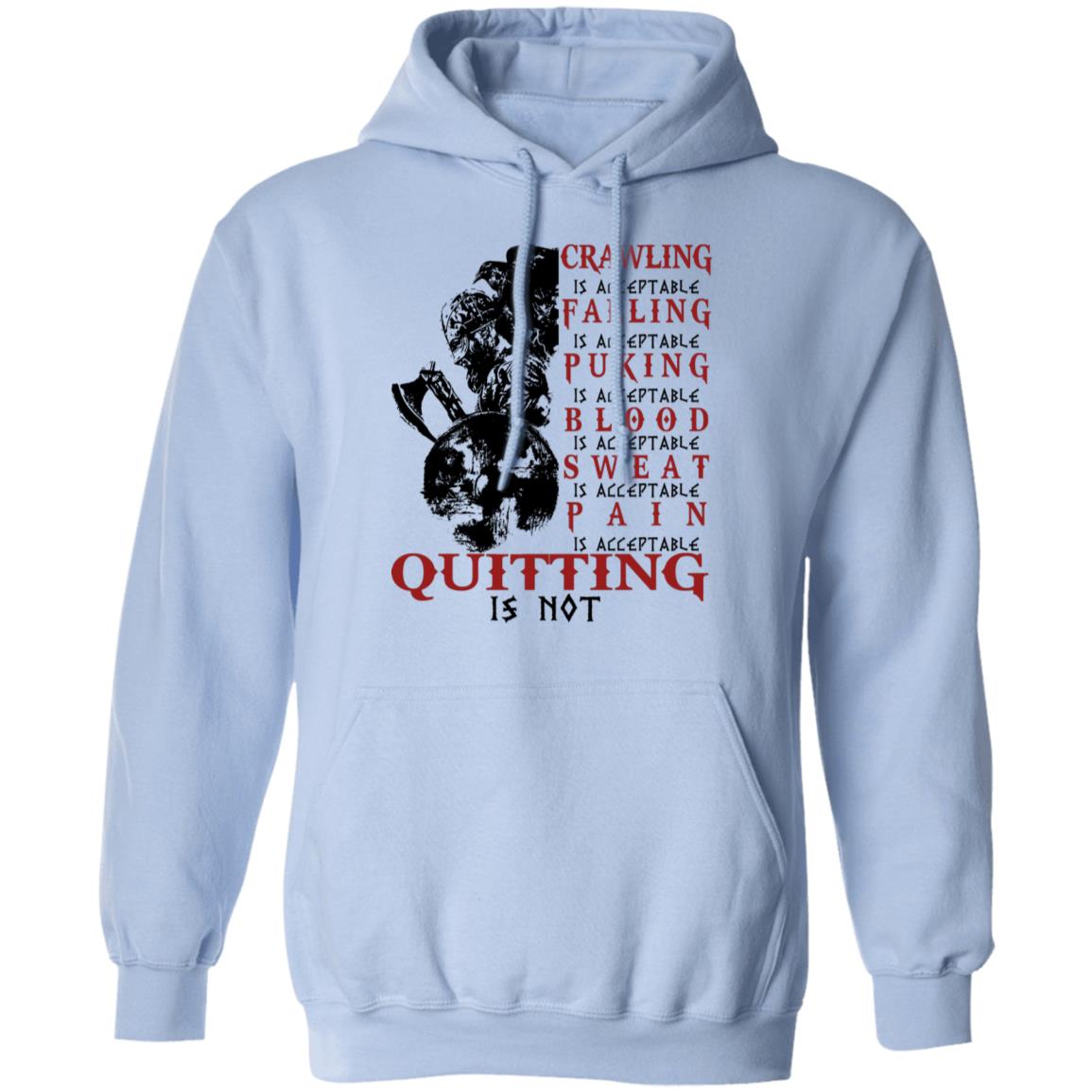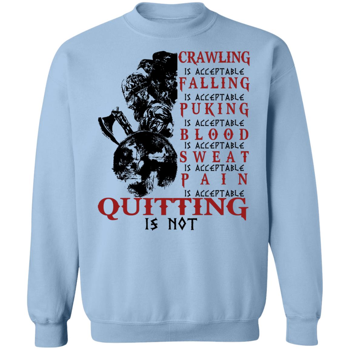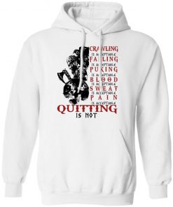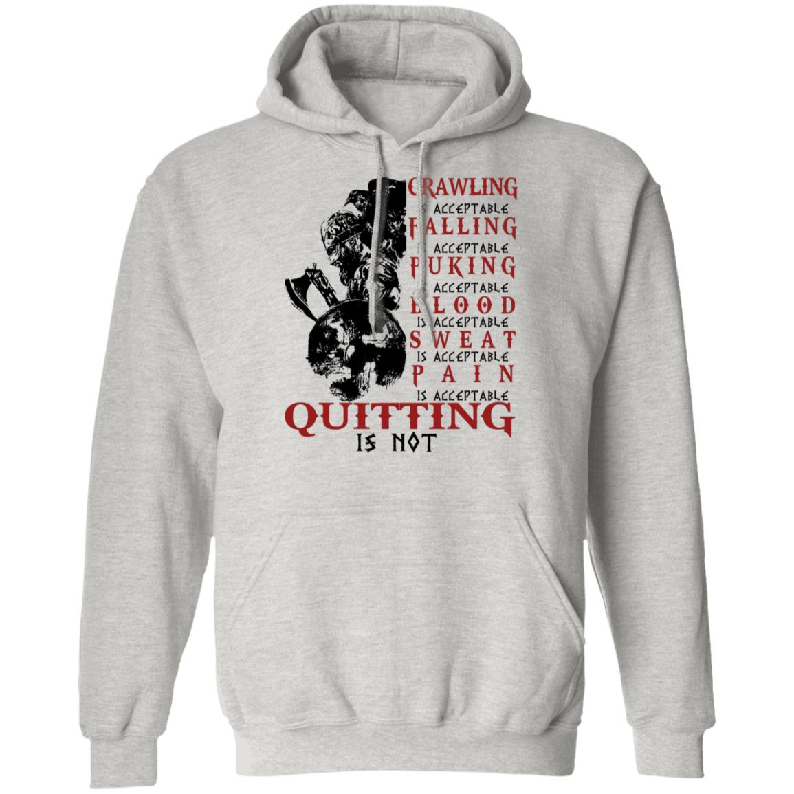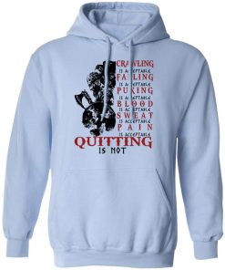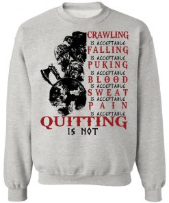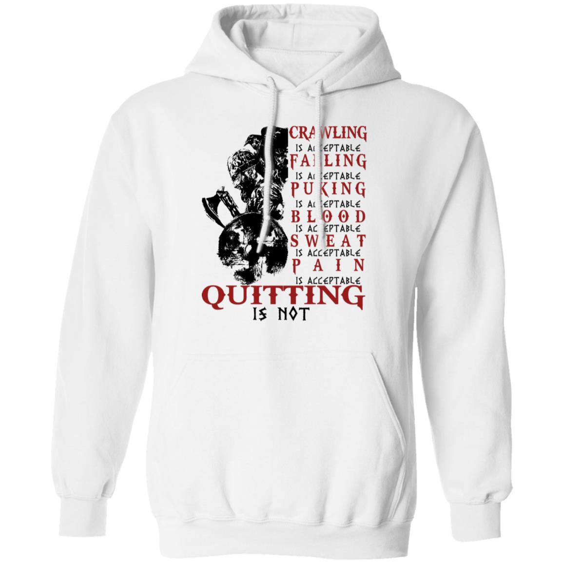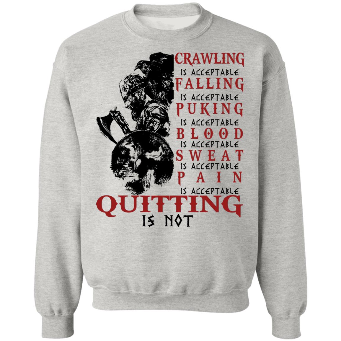 This shirt shows the rules of the Viking warriors. Crawling is acceptable. Falling is acceptable. Puking is acceptable. Blood is acceptable. Sweat is acceptable. Pain is acceptable. Quitting is not acceptable.